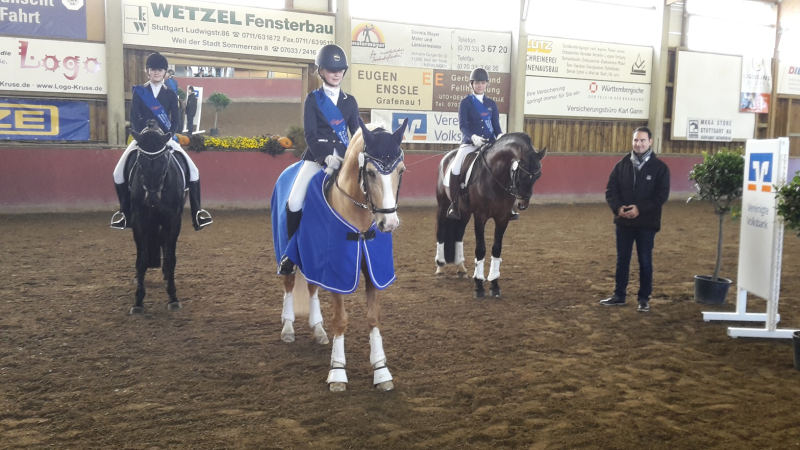 Die Finalprüfung in Weil der Stadt gewinnt Johanna Grobe (RV Waldenbuch-Hasenhof) auf Gitana vor Lisa Steisslinger (RFV Böblingen) und Sina Siegle (PSZ Benzenbühl) auf Nogal Su.